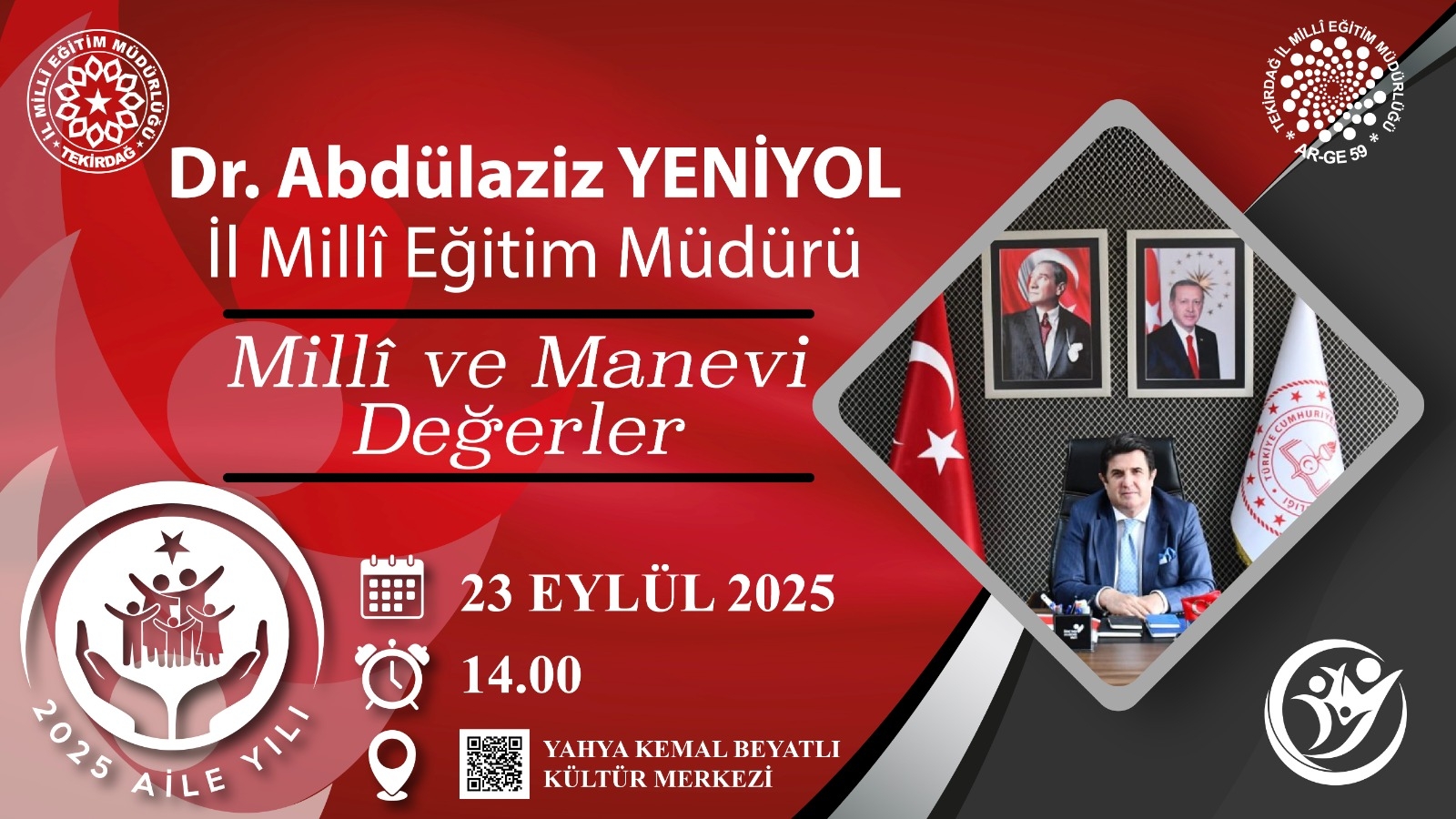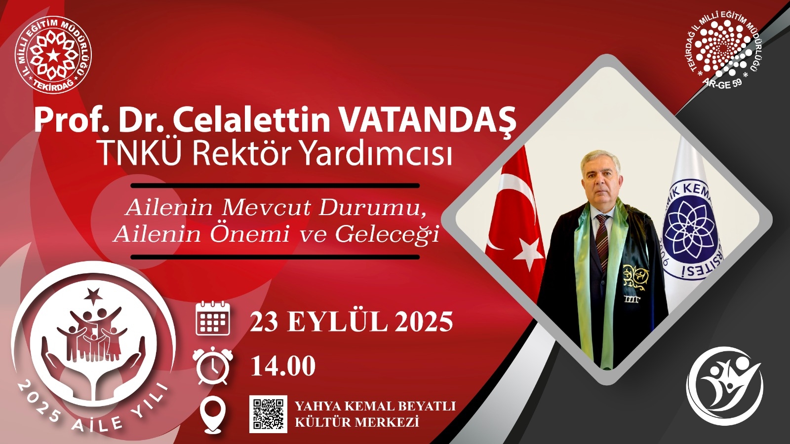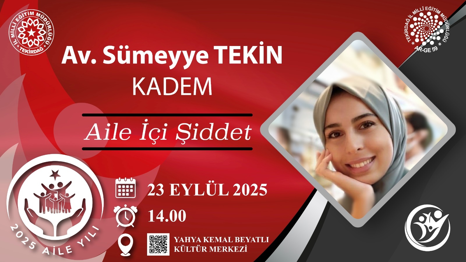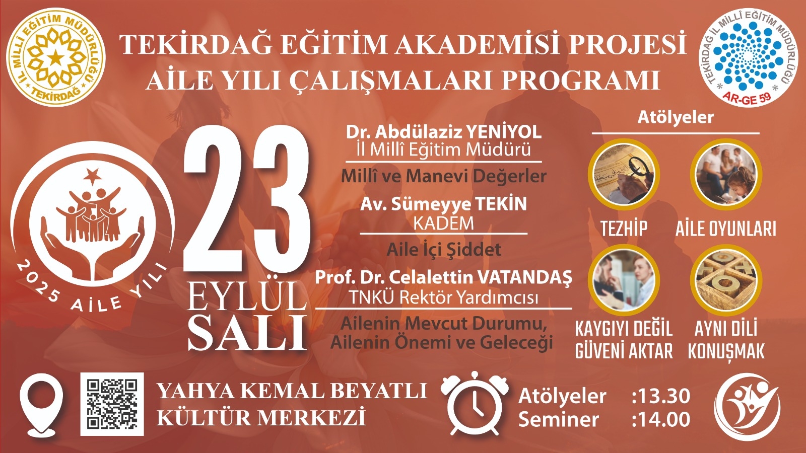 Müdürlüğümüzün Tekirdağ Eğitim Akademisi Projesi ile Aile yılı çalışmaları kapsamında velilerimiz için düzenlenen "Ailenin Mevcut Durumu, Ailenin Geleceği ve Önemi" konulu program 23 Eylül Salı Günü 13.30 'da Tekirdağ Yahya Kemal Beyatlı Kültür Merkezinde gerçekleştirilecektir. Programda İl Millî Müdürü Dr. Abdülaziz YENİYOL , KADEM İl Temsilcisi Av. Sümeyye TEKİN ve Cumhurbaşkanlığı Sosyal ve Gençlik Politikaları Üyesi, Sosyolog, Namık Kemal Üniversitesi Rektör Yardımcısı Prof. Dr. Celalettin Vatandaş' ın konuşmaları ile atölye çalışmaları yer alacaktır.