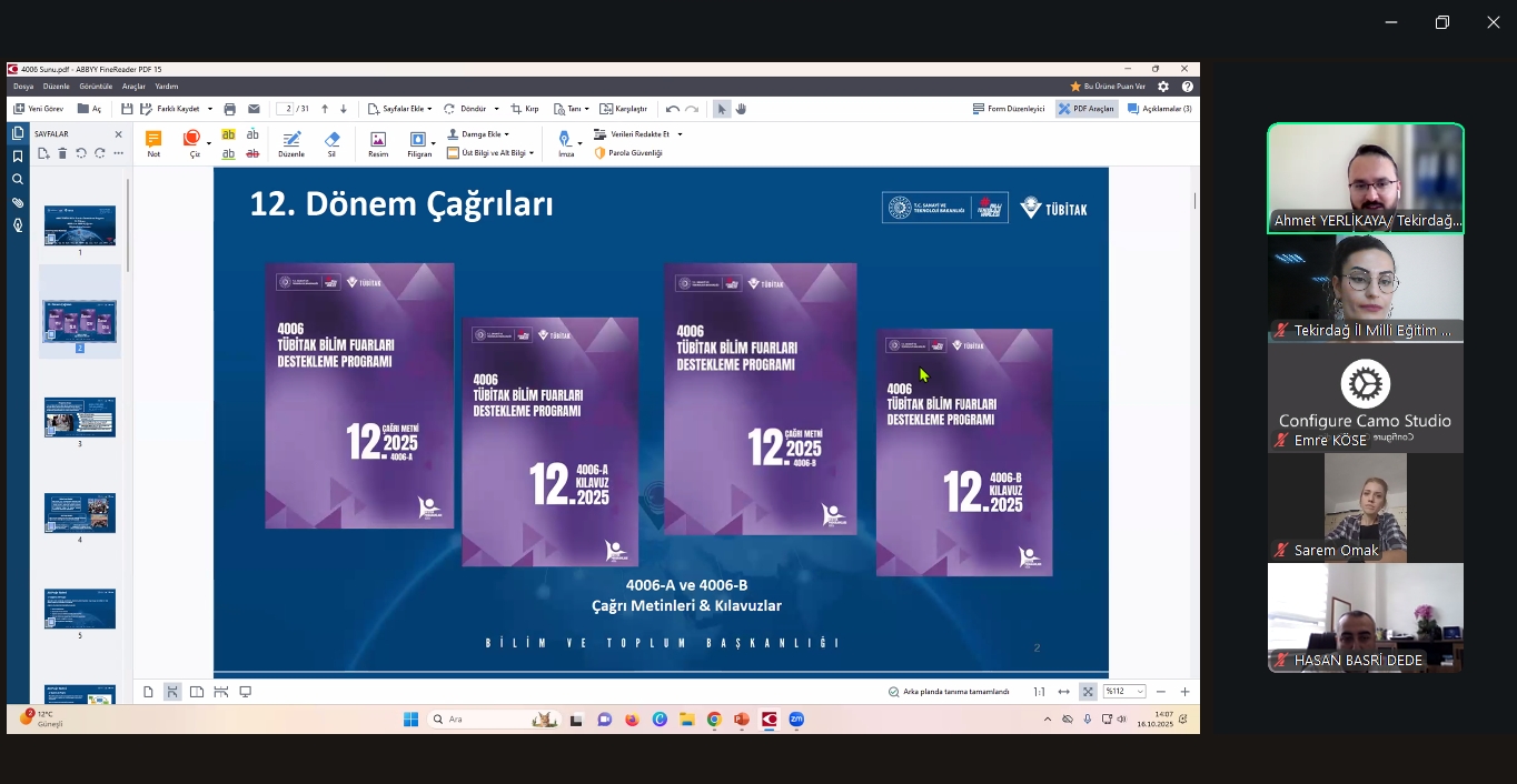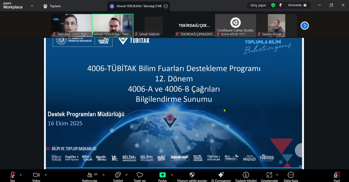 TÜBİTAK 4006 Bilim Fuarları kapsamında proje başvuru süreçleri, sistem üzerinden yapılacak işlemler ve dikkat edilmesi gereken noktalar konusunda katılımcılara detaylı bilgi verildi.